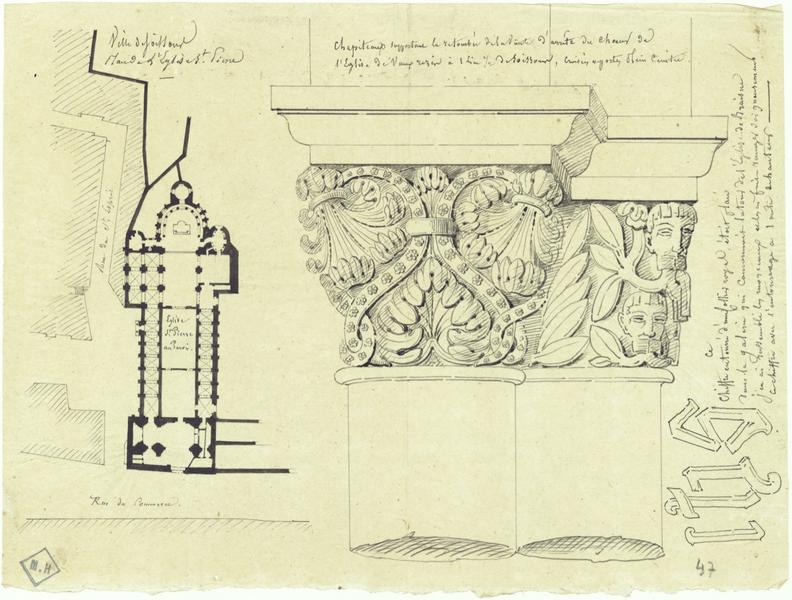 2 autres dessins : plan de l'église Saint-Pierre-au-Parvis de Soissons et détail d'un chpaiteau de l'église de Vaurezis