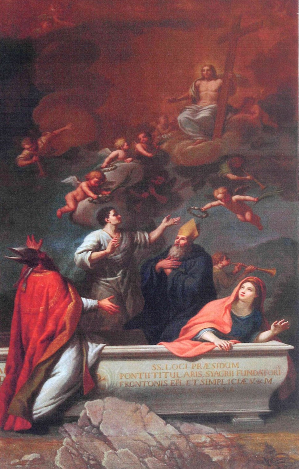 tableau : Saint Pons, saint Front, sainte Simplicie et saint Syagre, avec le Christ dans les nuées