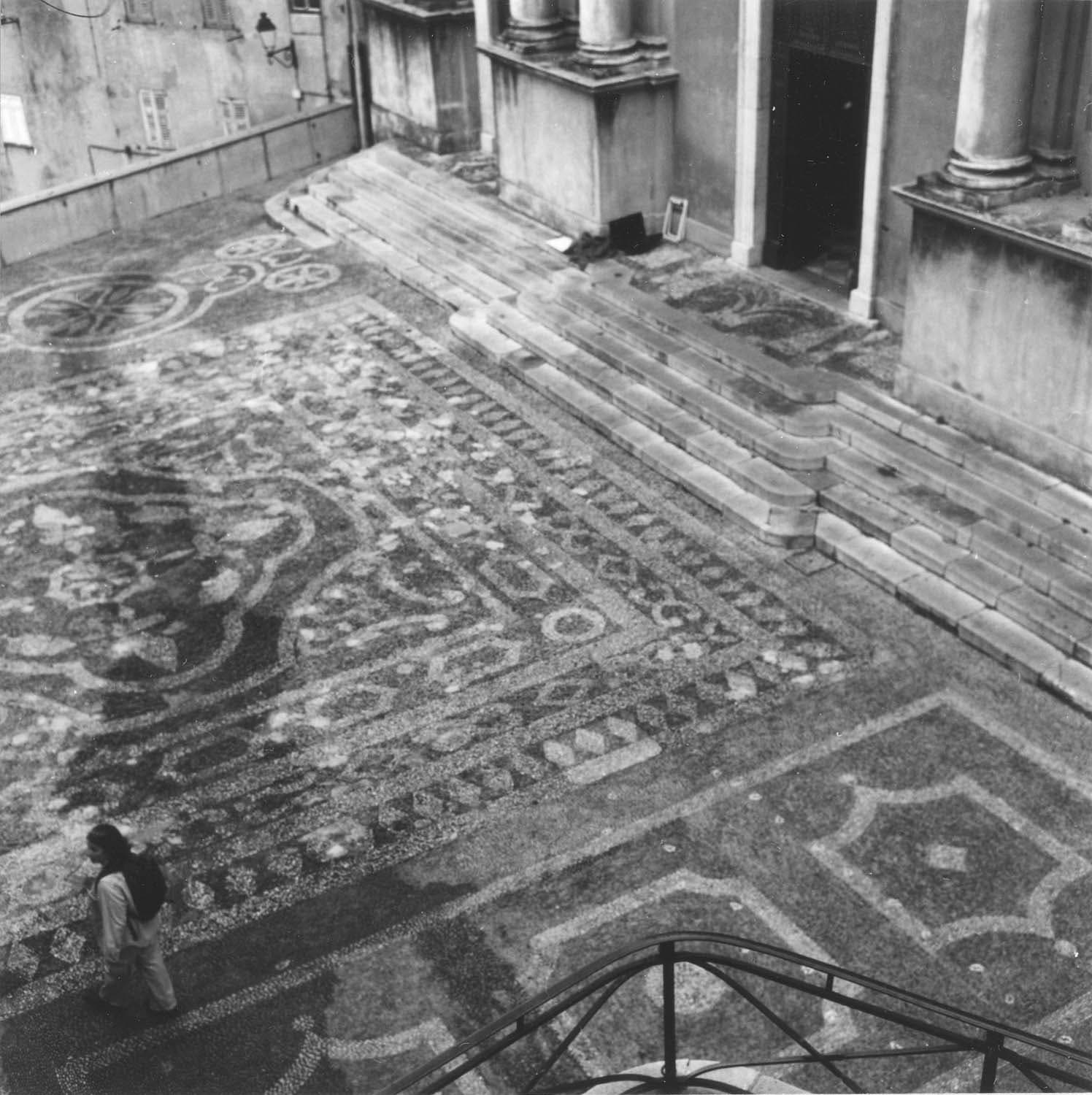 POP | Plateforme ouverte du patrimoineCalade du parvis de l'église. Tapis central en galets bicolores, blancs et gris, et marches d'entrée de l'église