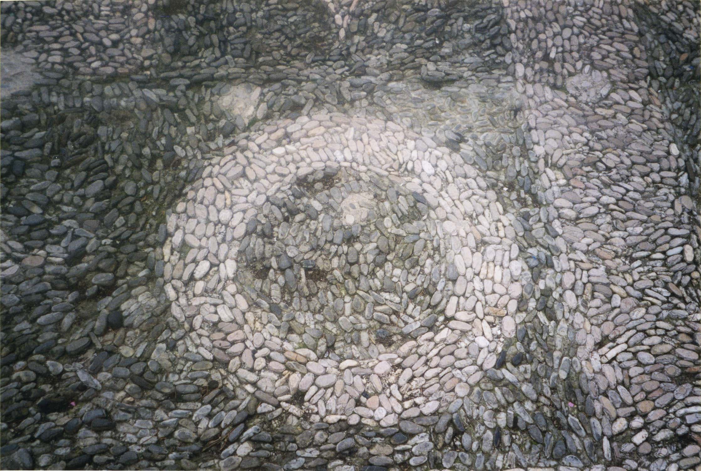 Calade du parvis de l'église. Tapis central en galets bicolores, blancs et gris. Détail d'un motif de forme circulaire, en bordure du motif central