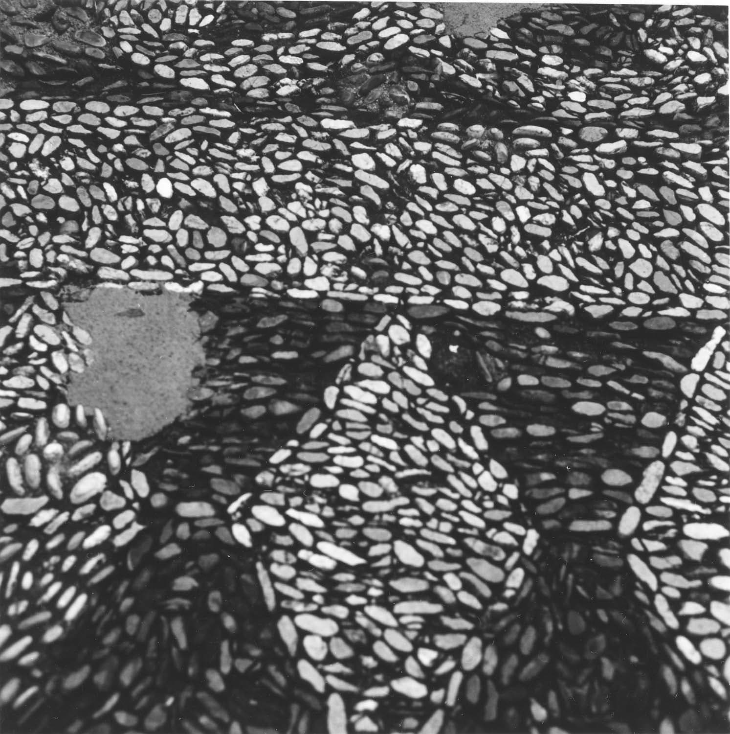 Calade du parvis de l'église. Tapis central en galets bicolores, blancs et gris. Détail des motifs du pourtour, bande et losanges
