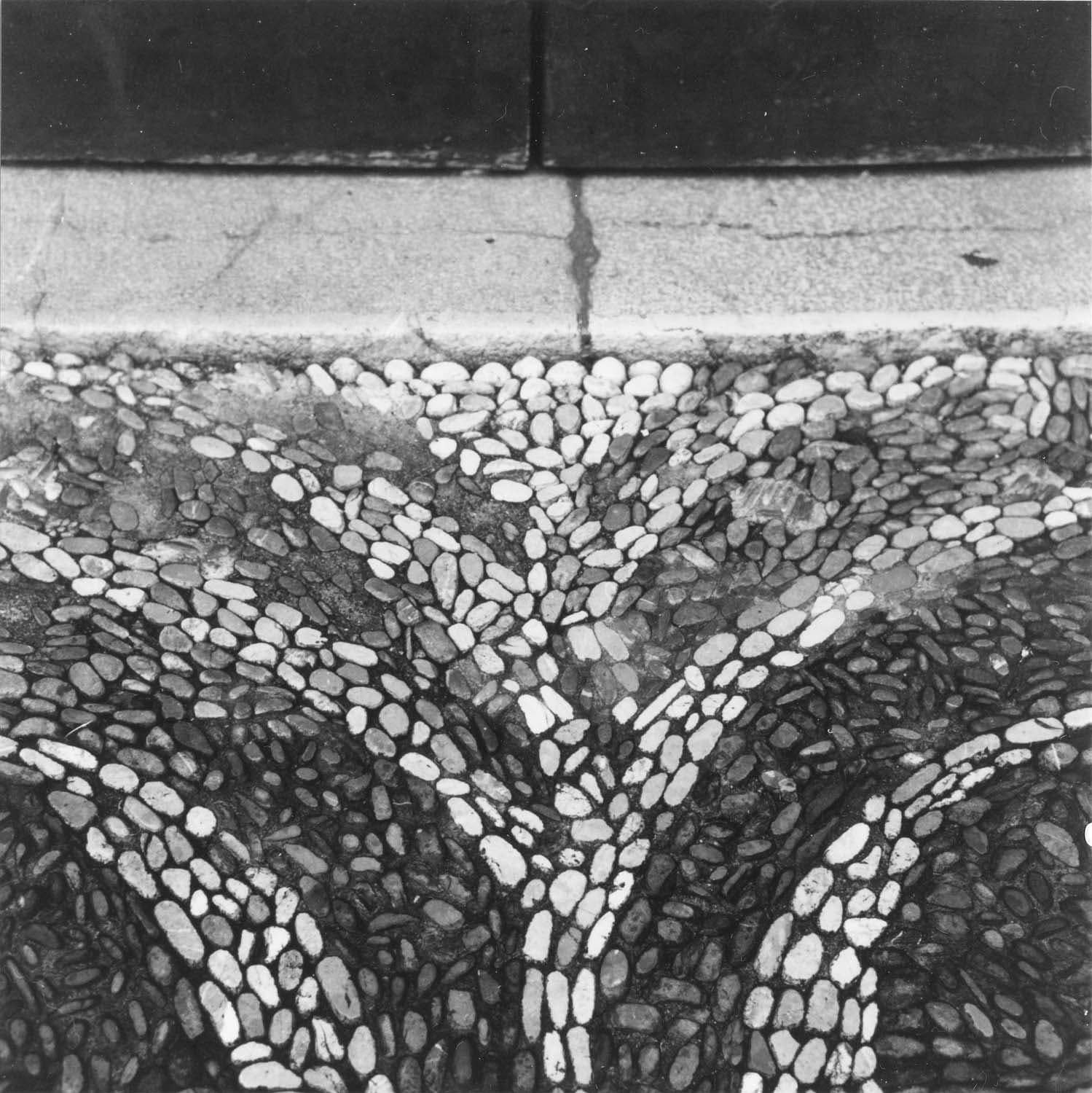 Calade du parvis de l'église. Détail d'un motif devant la porte d'entrée principale de l'église, plante stylisée
