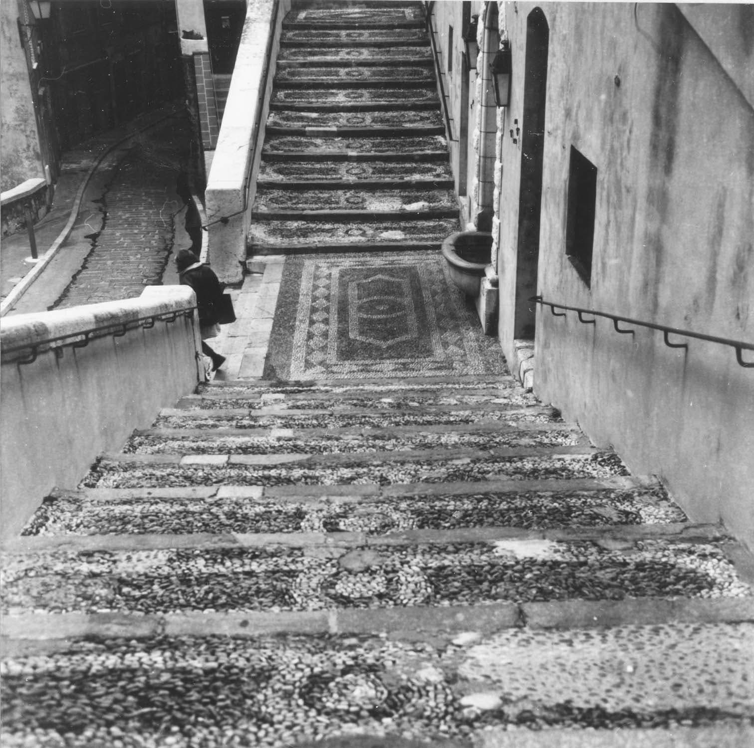 POP | Plateforme ouverte du patrimoineCalade des rampes Saint-Michel. Marches en galets bicolores, blancs et gris, palier décoré devant la fontaine