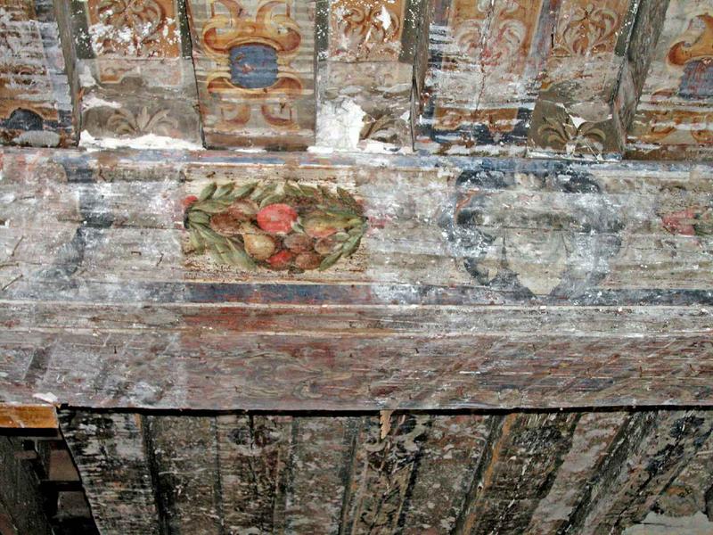 Salle ouest, 1er étage. Plafond peint, décor de la poutre maîtresse