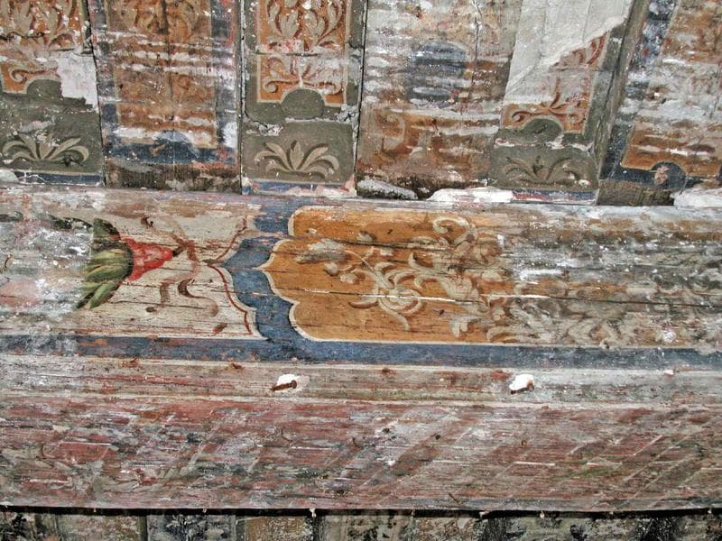 Salle ouest, 1er étage. Plafond peint, décor de la poutre maîtresse
