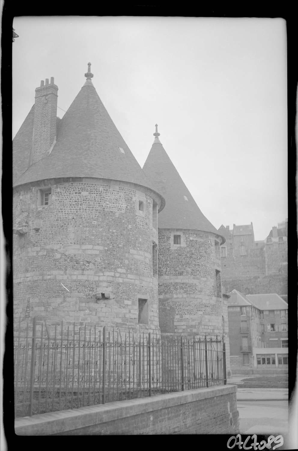 Vue de côté des tours : toitures restaurées