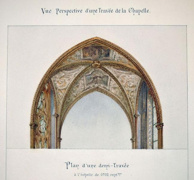 Photographie numérique du relevé de peinture murale PM09339. Vue perspective d'une travée de la chapelle. Détail de la décoration des voûtes réalisée par Aubin Vouet.