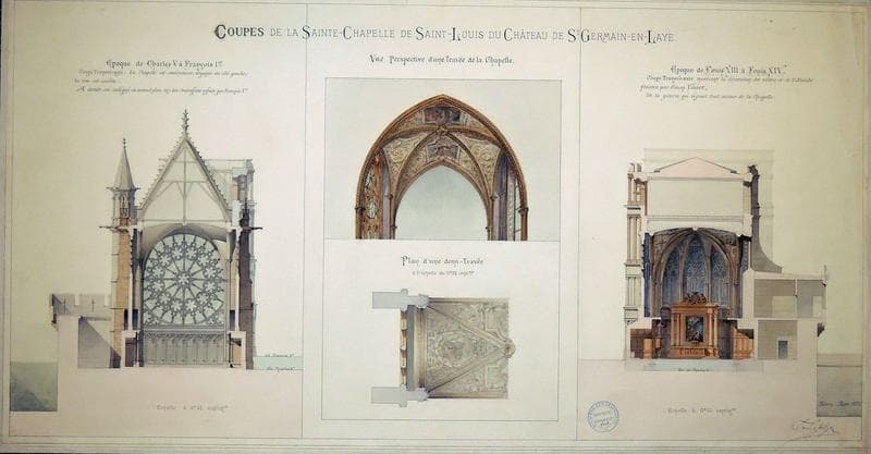 POP | Plateforme ouverte du patrimoinePhotographie numérique du relevé de peinture murale PM09339. Coupes de la Sainte-Chapelle de Saint-Louis. Détail de la rose, des voûtes décorées par Aubin Vouet et du tableau d'autel commandé à Nicolas Poussin (L'Institution de l'Eucharistie, 1641, musée du Louvre)