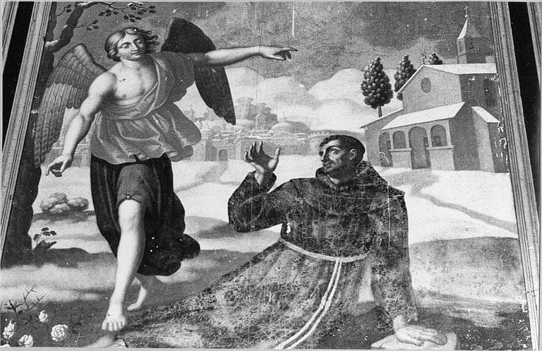Tableau : 'Saint François d'Assise devant l'église de Portioncule', huile sur toile