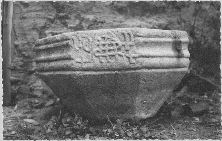 Bénitier : cuve octogonale utilisée comme bénitier, motif d'entrelacs, moulures, pierre sculptée