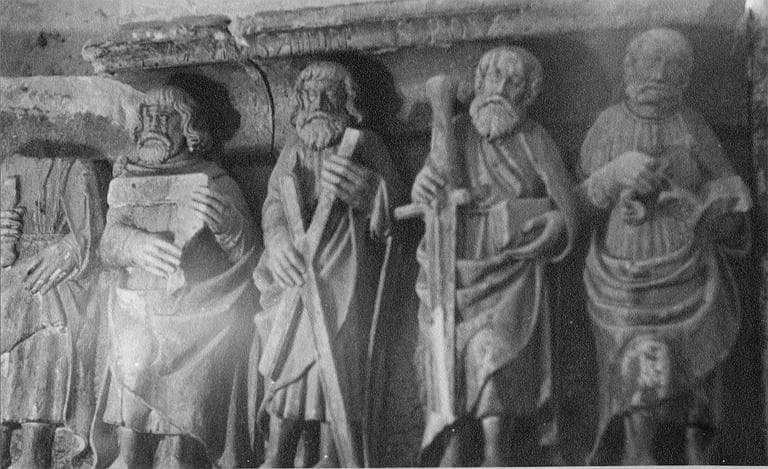 Retable : bas-relief provenant probablement d'un ancien retable, représentant le Christ et les 12 apôtres (détail)
