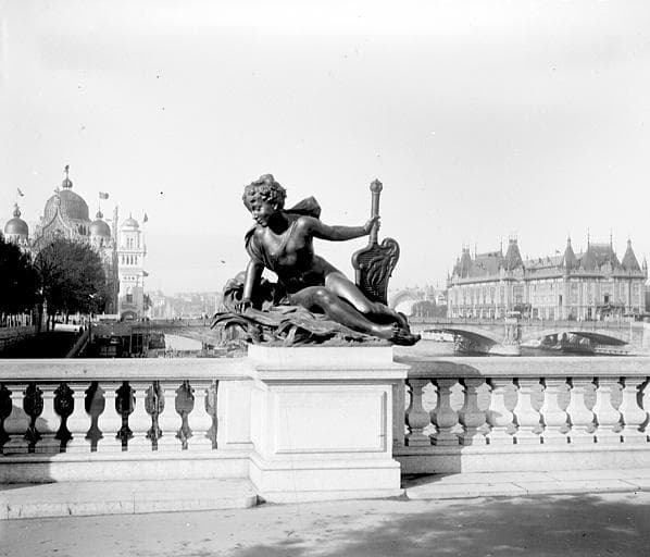 Statue du pont et en arrière plan pavillons d'exposition
