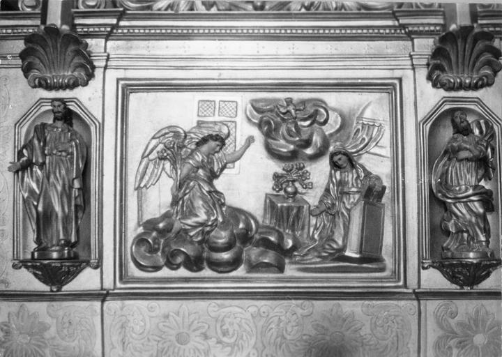 Tabernacle, bas-relief, statuettes (2) : L'Annonciation, Saint Paul, Saint André, bois sculpté, peint, doré