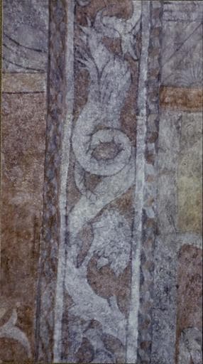 Peinture monumentale : détail d'une frise mêlant éléments végétaux et animaux fantastiques, peinture sur enduit