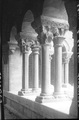 Cloître : colonnes et chapiteaux dans une galerie