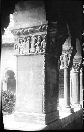 Cloître : colonnes et chapiteaux dans une galerie