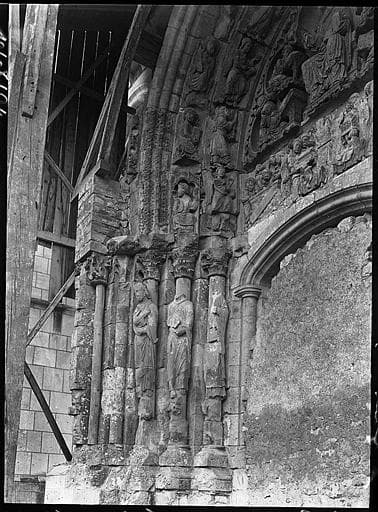 Portail muré de la façade nord en cours de restauration : tympan et voussures