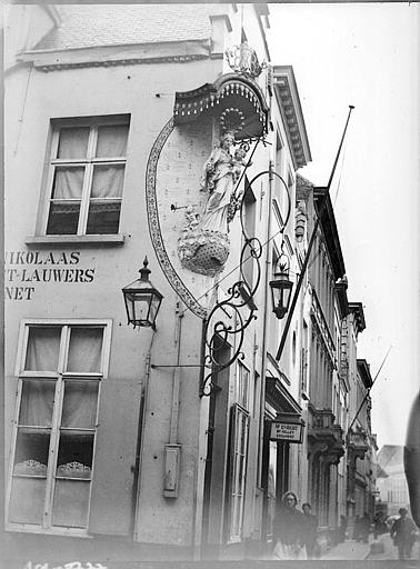 A l'angle de rues, lanterne suspendue : Vierge à l'Enfant sous un dais