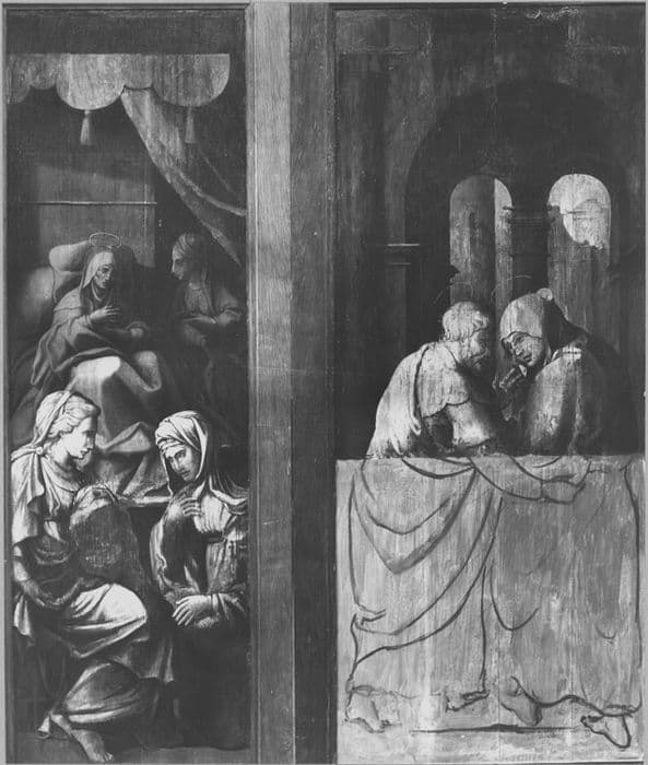 Panneaux peints, revers (Naissance de la Vierge et Rencontre à la porte dorée, grisailles)