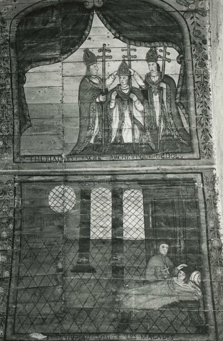 POP | Plateforme ouverte du patrimoineEglise Saint-Thuriau : Voûte lambrissée peinte, scènes : Saint Turiau est sacré archevêque de Dol (partie haute), saint Thuriau visite les malades (partie basse)