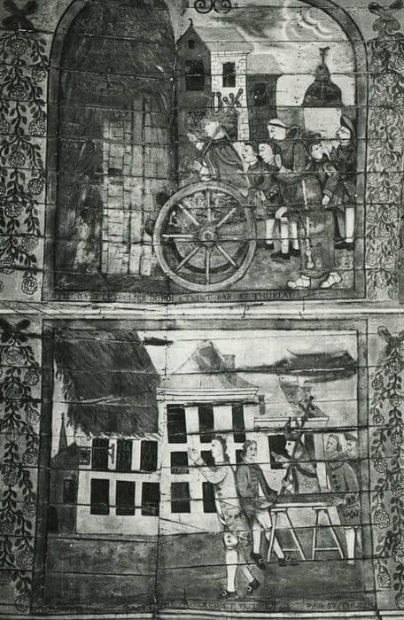 Eglise Saint-Thuriau : Voûte lambrissée peinte, scènes : Saint Thuriau éteint le feu dans le cellier du roi (partie haute), saint Thuriau éteint le feu dans une auberge (partie basse)