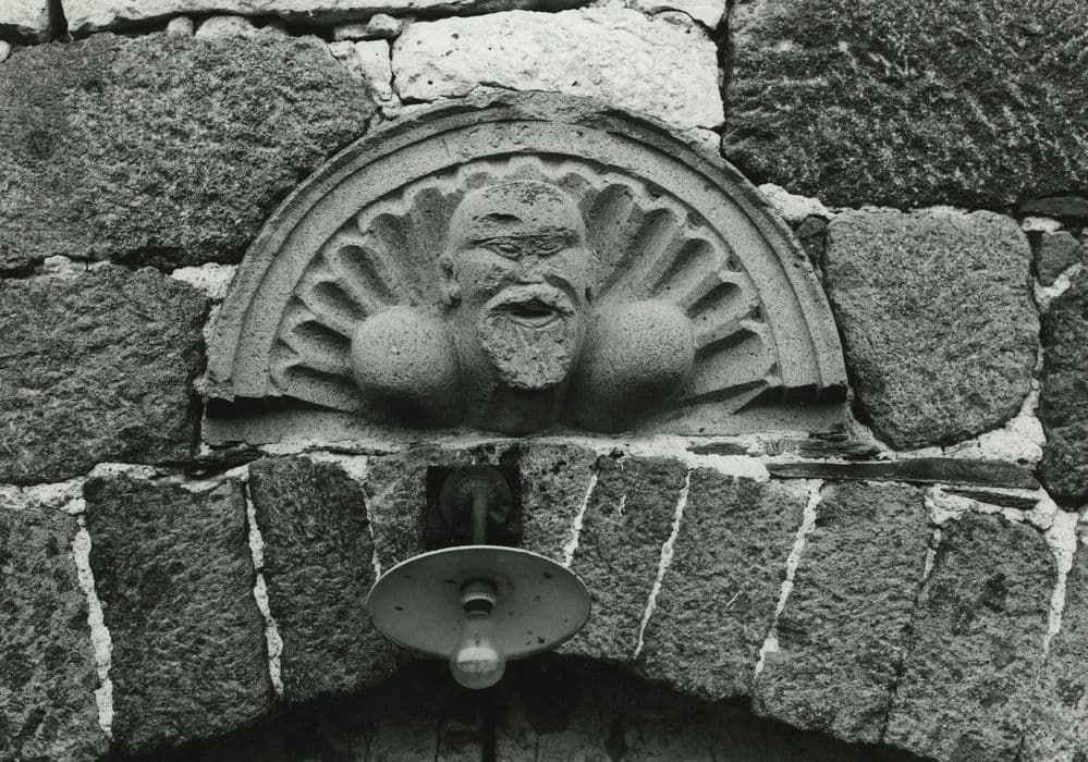 Ferme de la Borie-Grande : Grange, pignon est, détail d’un élément sculpté réutilisé