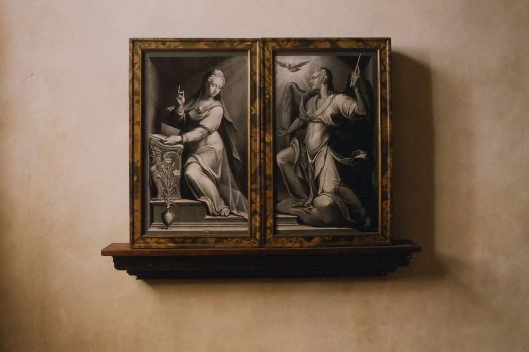 tableau (triptyque) : la Trinité entourée d'anges portant les instruments de la Passion (volets fermés : Annonciation l’)