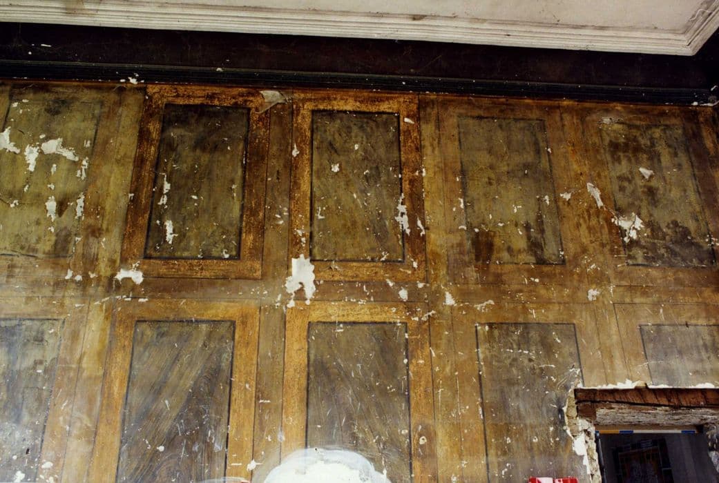 rez-de-chaussée, bibliothèque, peinture monumentale de faux lambris, détail