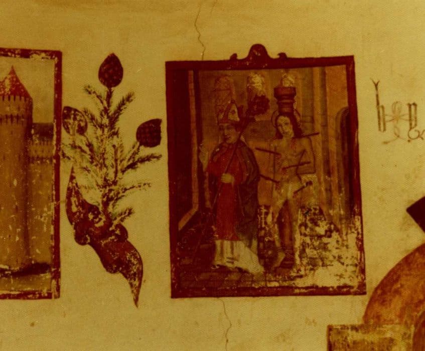 oratoire, peintures monumentales, détail : saint Sébastien accompagné d’un évêque