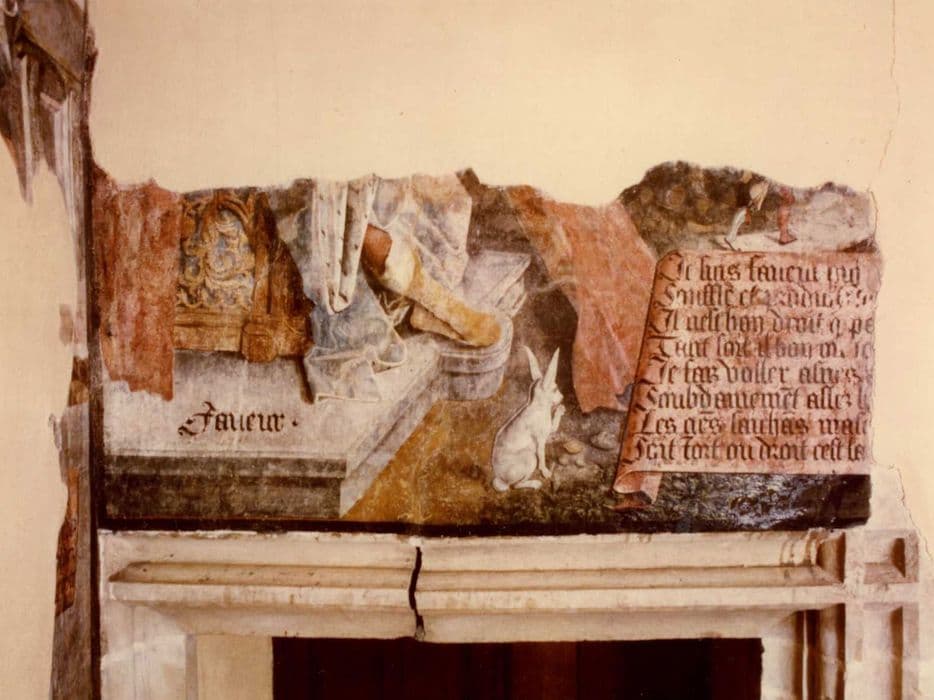 galerie desservant le 1er étage du second corps de logis, peintures monumentales, détail