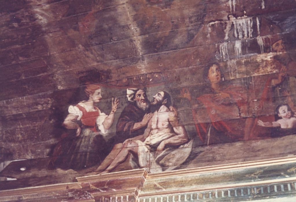 voûte lambrissée de la nef, peintures monumentales, détail