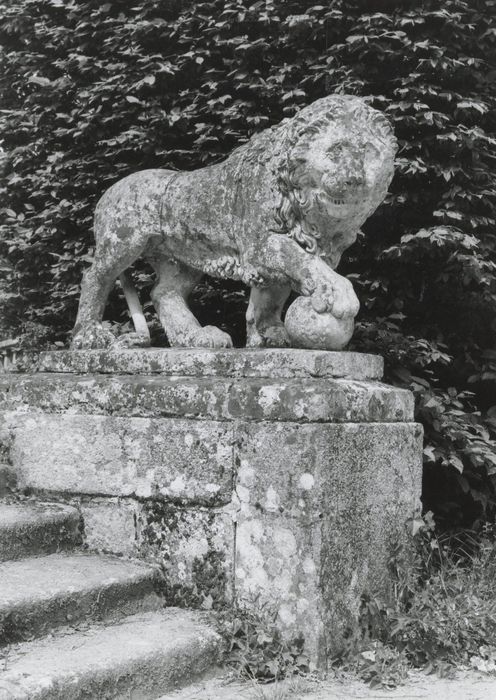 parc, escalier de l’hémicycle, détail d’une statue de lion