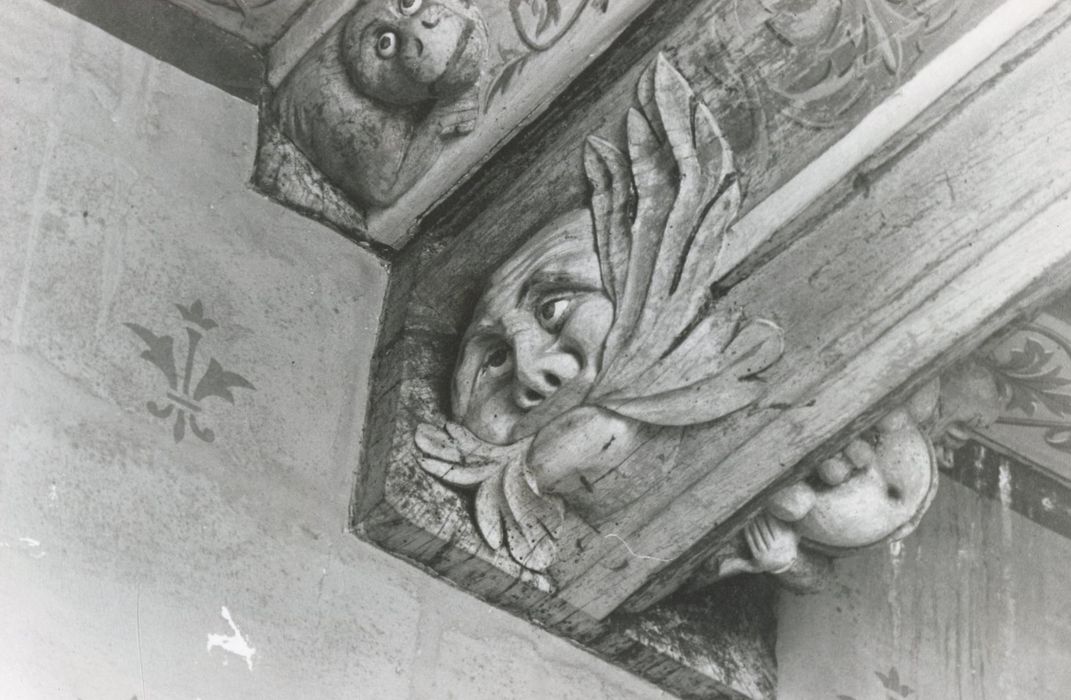 « château neuf », 1er étage, salle dit « du grand passage », détail des sculptures des poutres