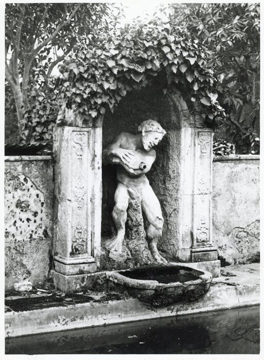 Statue avec sa niche et sa vasque servant d'ornement à une pièce d'eau