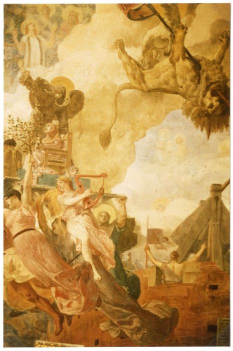 salle des Illustres, détail du décor (Glorification de la femme qui lança la pierre meurtrière de Simon de Montfort)