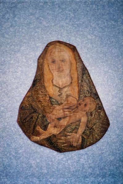 fragment de broderie provenant d'un devant d'autel (supposé) : Vierge allaitant en buste