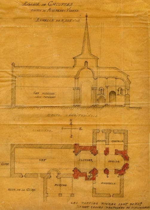 coupe longitudinale, plan (dessin : crayon sur papier)