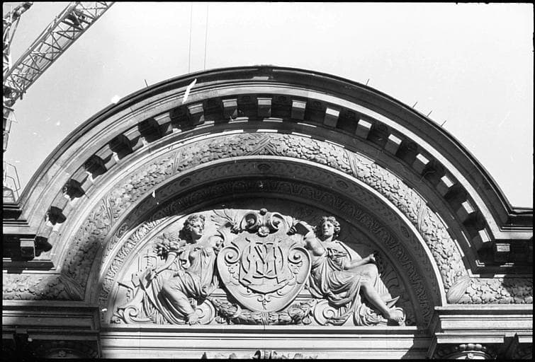 POP | Plateforme ouverte du patrimoineFronton orné de deux figures féminines autour d'un écusson : vue rapprochée