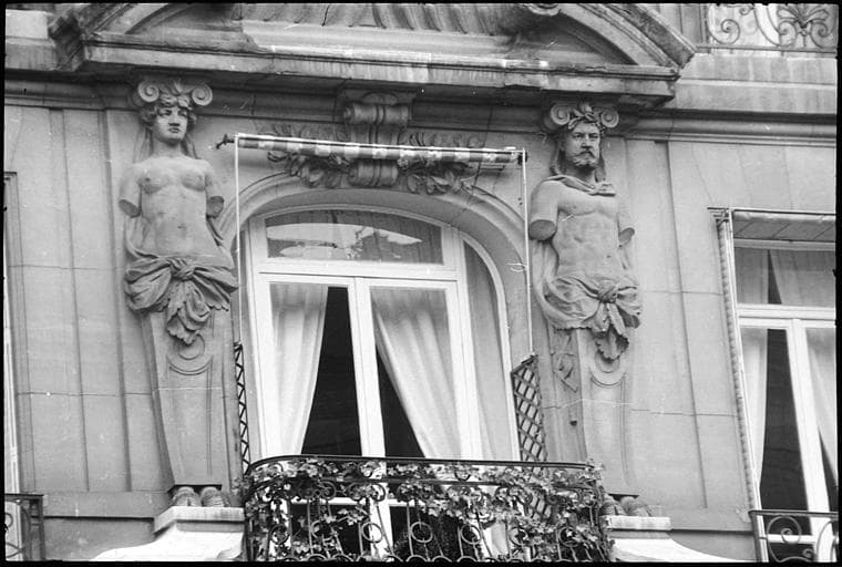 POP | Plateforme ouverte du patrimoineFaçade ornée d'un atlante et d'une cariatide en gaine sans bras : vue rapprochée