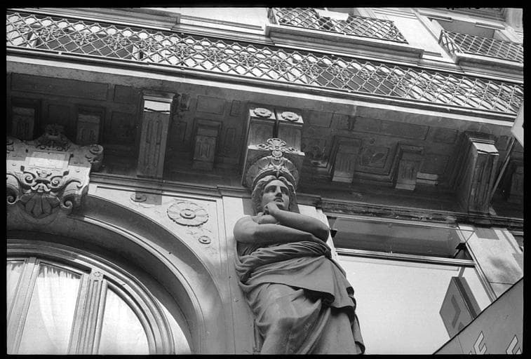 POP | Plateforme ouverte du patrimoinePorche flanqué de deux cariatides en pied : partie supérieure de la cariatide de droite vue en contreplongée