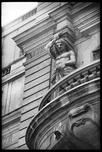 Façade ornée d'atlantes en gaine avec bras : vue rapprochée d'un atlante