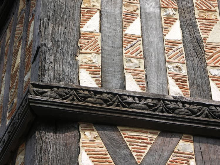 Façade : détail de la lisse sculptée ; pan de bois