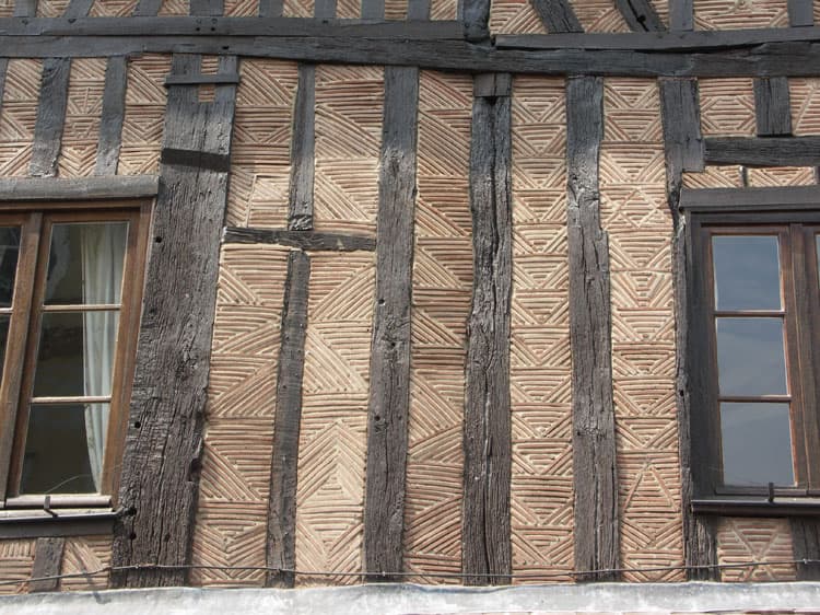Détail du mur de façade ; pan de bois et hourdis en brique
