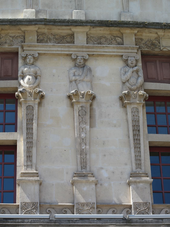 Façade sur la place : pilastres surmontés de figures sculptées entre deux fenêtres