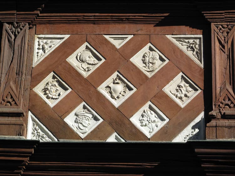 Façade sur rue : pans de bois et éléments décoratifs