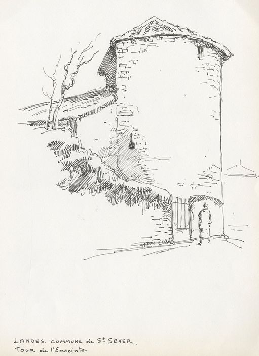 vue partielle des vestiges, tour d’enceinte (dessin : encre sur papier)