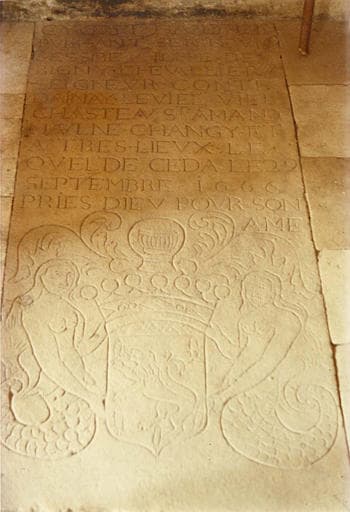 Dalle funéraire de Philippe de Bigny, pierre calcaire gravée d'une inscription et de ses armoiries portées par deux sirènes, 1666