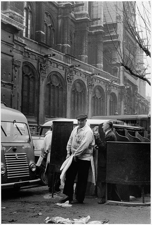 Pissotière à Saint-Eustache, Paris, 1960 ; [Marché des Halles, boucher sortant d'une vespasienne]