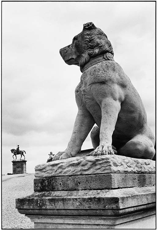 La terrasse du château de Chantilly (Oise), 1993 ; [Molosse ; Statue équestre d'Anne de Montmorency]