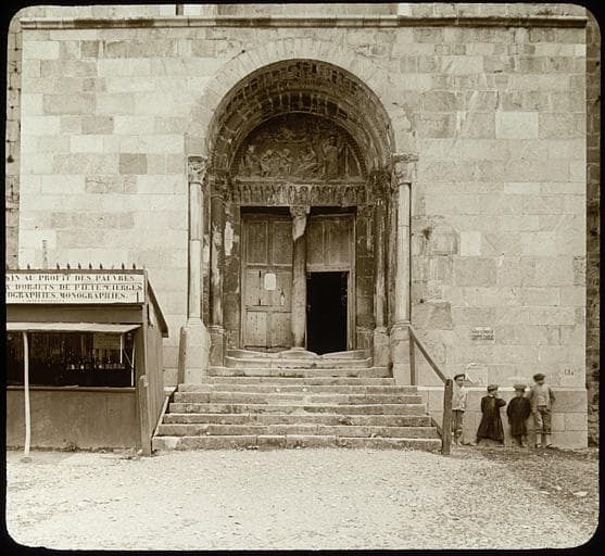 POP | Plateforme ouverte du patrimoinePortail roman, vue d'ensemble, quatre enfants appuyés contre le mur, stand de vente de souvenirs religieux